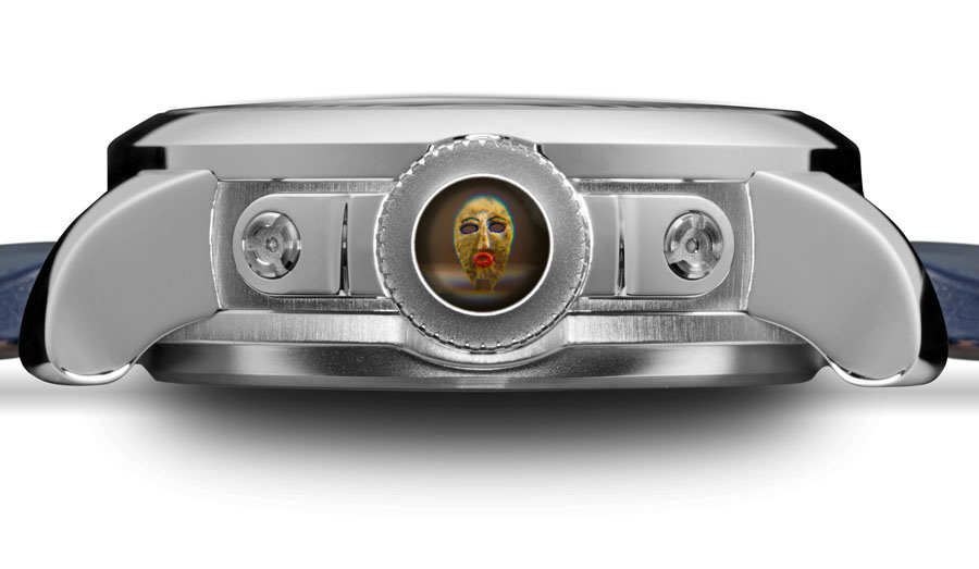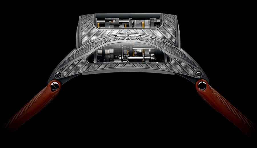 Parmigiani Bugatti Type 370 Victoire: Aufwändige Gravuren auf dem Gehäuse, die sich auf dem Kalbslederband fortsetzen. Die Zeit .wird von dem senkrecht stehenden Ziffer- blatt abgelesen. |