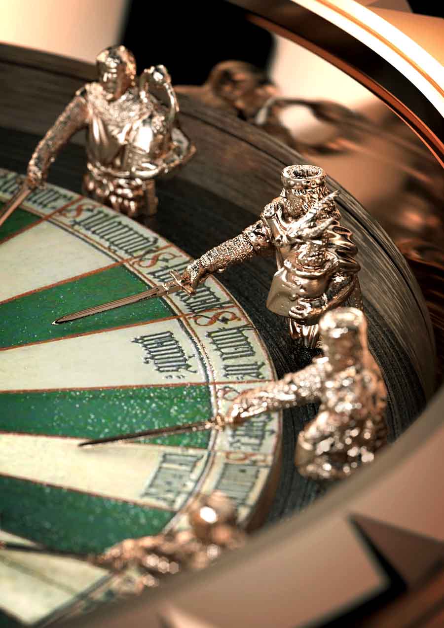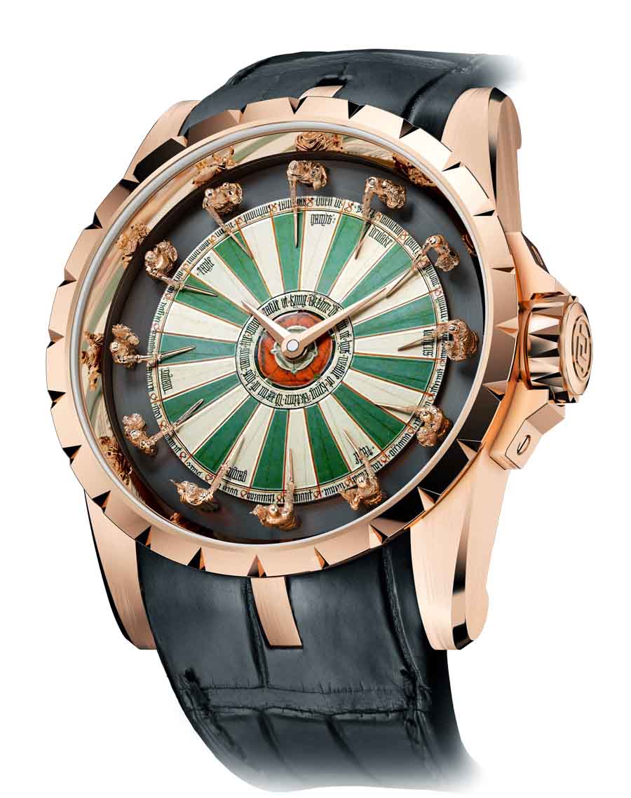 Roger Dubuis Excalibur Table Ronde Das .Zifferblatt symbolisiert die .legendäre Tafelrunde an dem König Artus und seine Ritter zusammengekommen sind. Als Design-Vorlage dient eine runde .Tischplatte, die. in .der. großen. Halle von .Winchester Castle hängt und als .das .historische. Relikt .aus .dem. Mittelalter. gilt. Zwölf.. aus .Gold gegossene Ritterfiguren, die gleichzeitig die .Funktion als .Stundenmarker übernehmen, zeigen .mit ihren .Schwertern zum .Zentrum des .mehrfarbig emailierten Zifferblatts, in deren. Mitte sich, wie beim historischen Vorbild, das Wappen - die Tudor-Rose - befindet. |