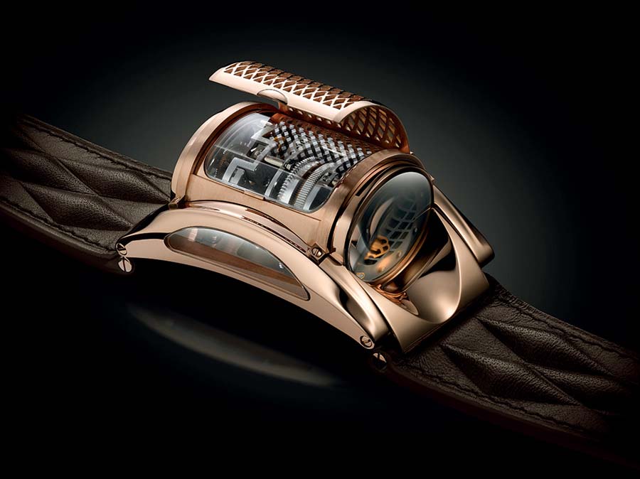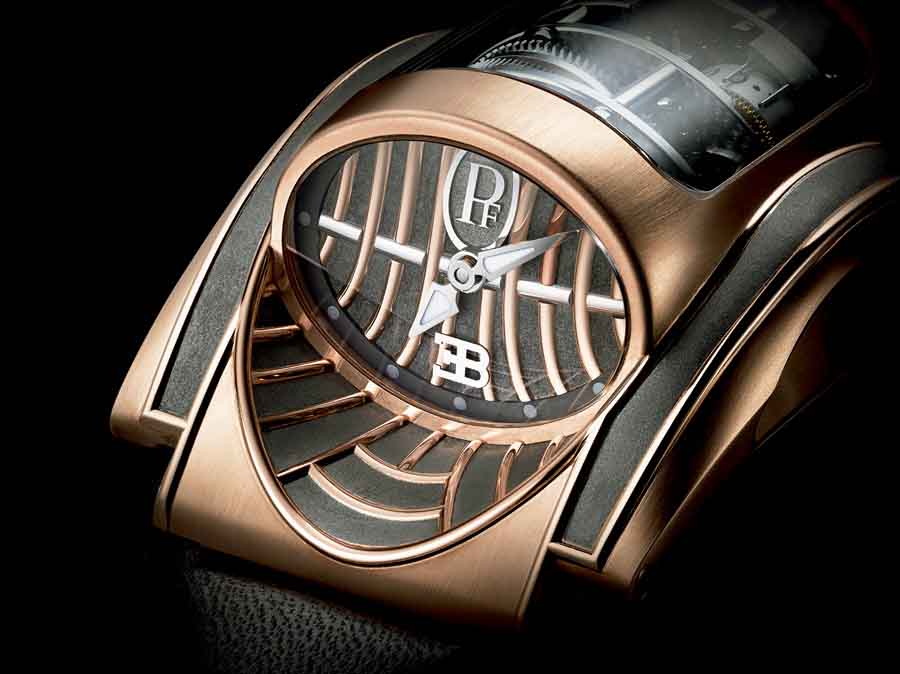 | Parmigiani Bugatti Type 370 Mythe: Ohne Klappgitter, dafür mit teils grau gekörnten und teils roségoldenen Oberflächenveredelungen. |